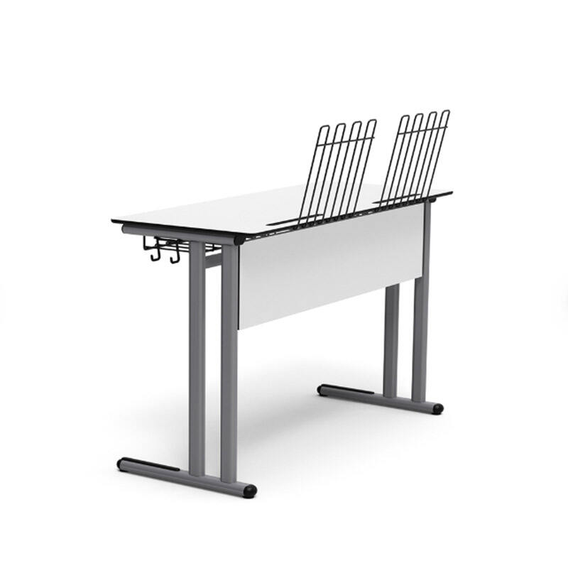 Salle de cours : Bureau inclinable fixe + agencement en couches pour garantir une vue dégagée pour la dernière rangée, matériaux mixtes acier et bois améliorent la stabilité de charge.
